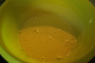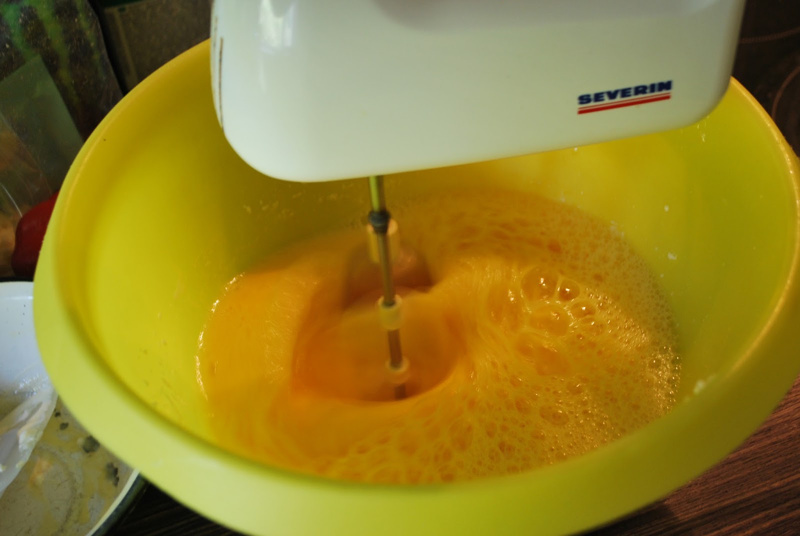 First of all you crack your 10 eggs into a big bowl, add salt and baking powder. Whisk until nice and fluffy like so: