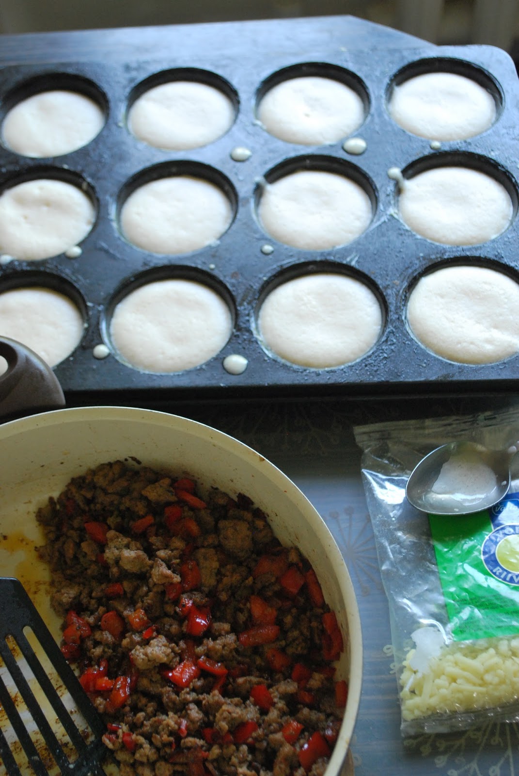 Divide your meat filling evenly, then sprinkle the tops with grated cheese. If you like them really cheesey, use more cheese, 50 grams isn’t that much, just adds a little flavour.