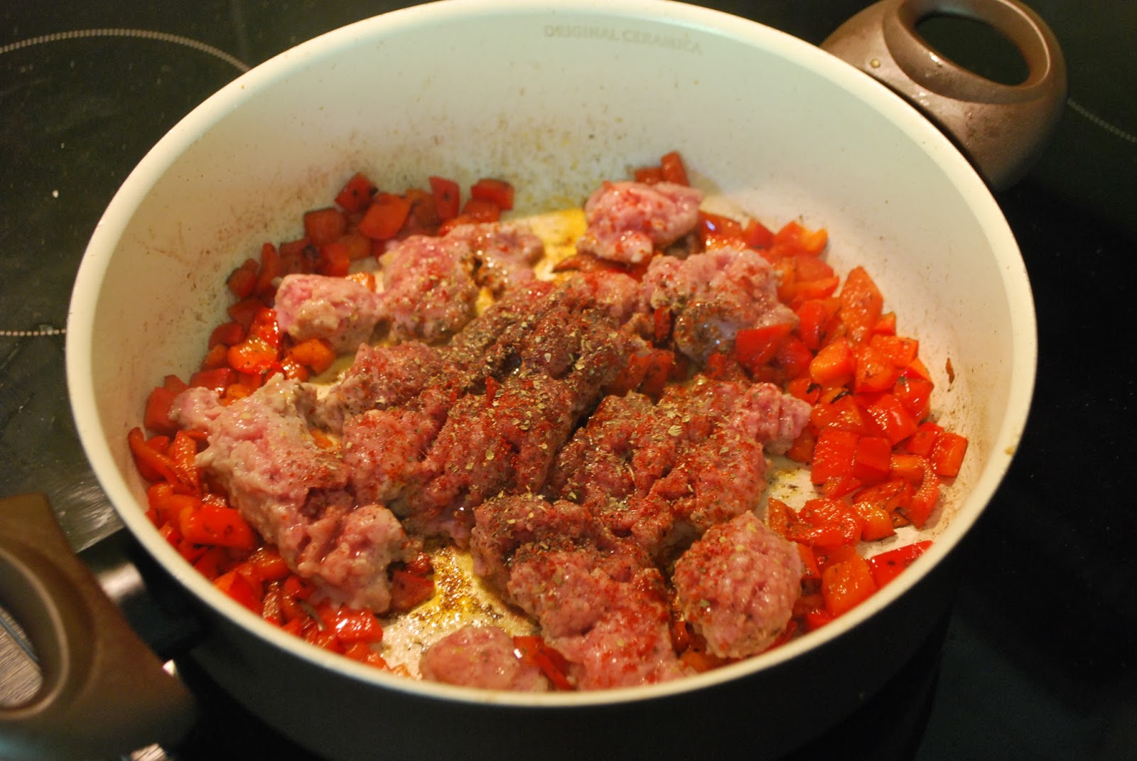 Now add in ground pork, add pepper, ground paprica and salt. NB! Be cafeful with salt, you already have salt in the egg mixture. Break the ground pork into small pieces while frying it.