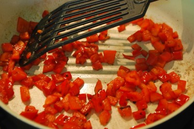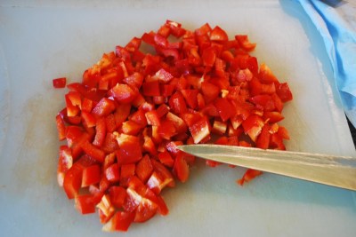 Put the egg mixture aside. Then chop up your red bell pepper into small pieces.