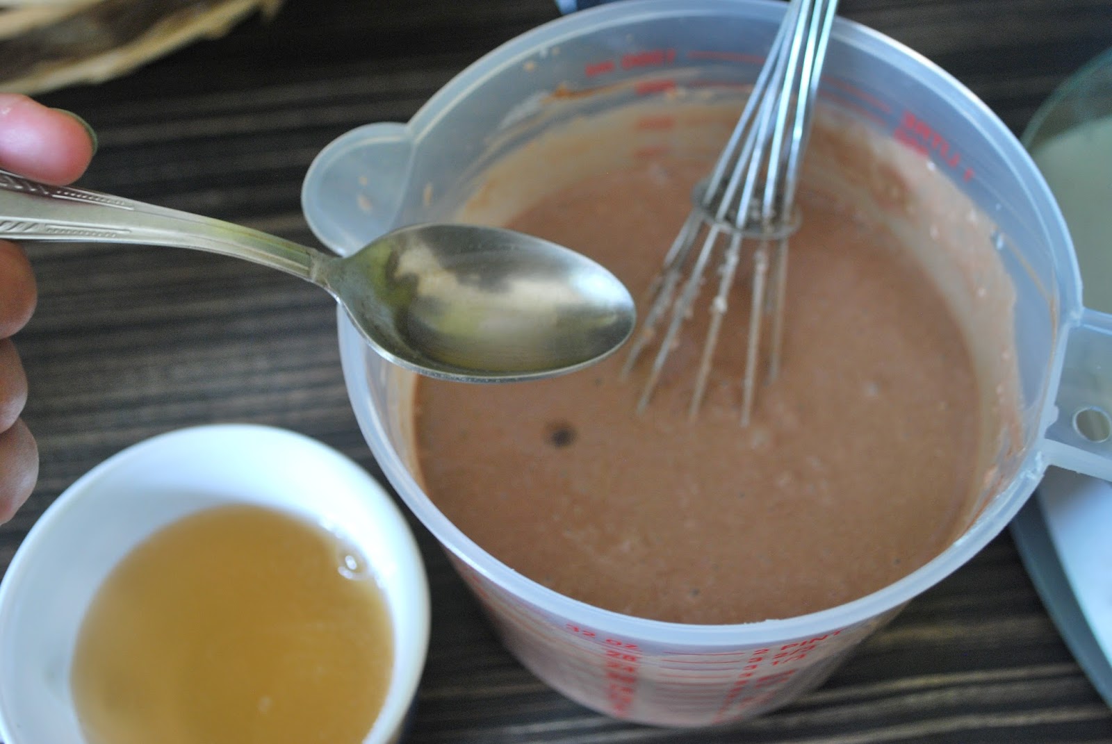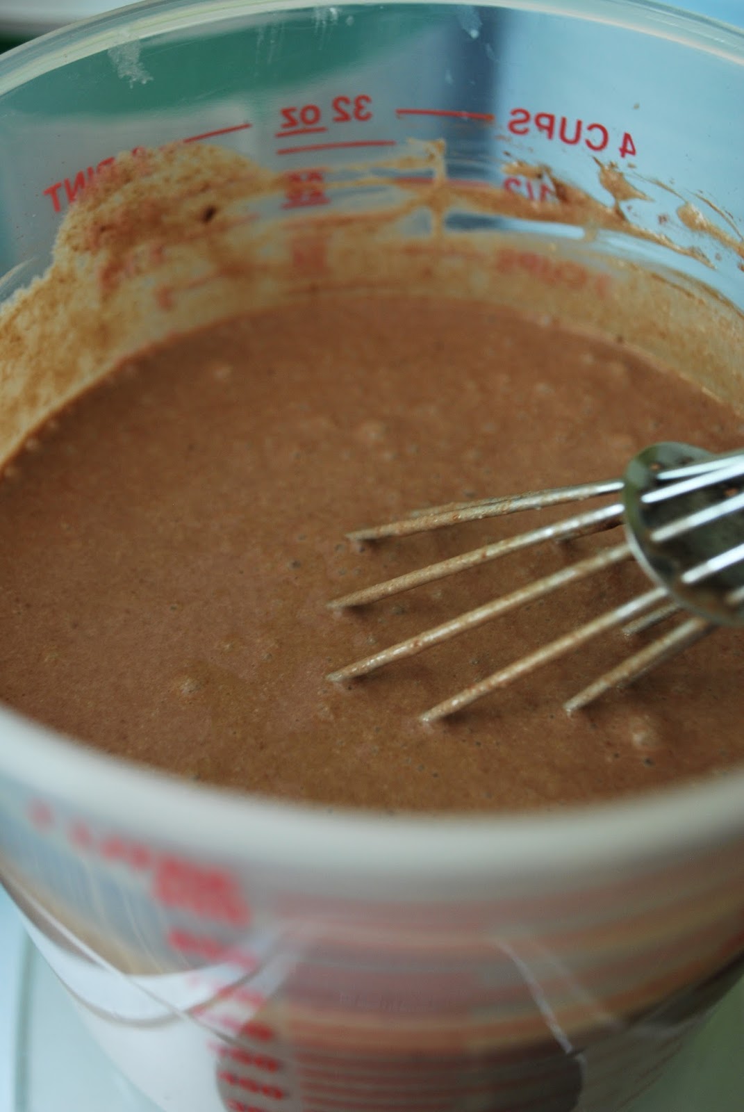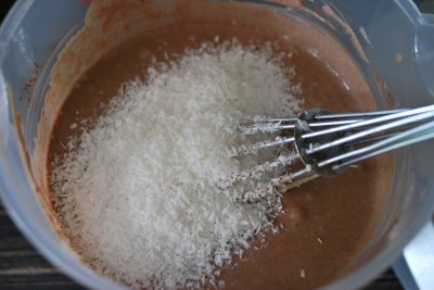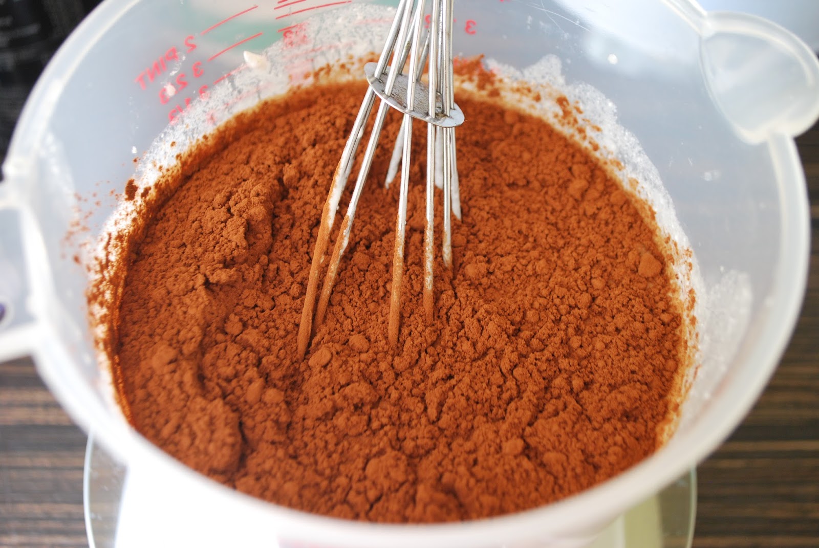 Now add the dark cocoa. Be careful not to pour it in too fast or you’ll be covered in it (mistake made often in my kitchen). Whisk it in really well, make sure there are no lumps.