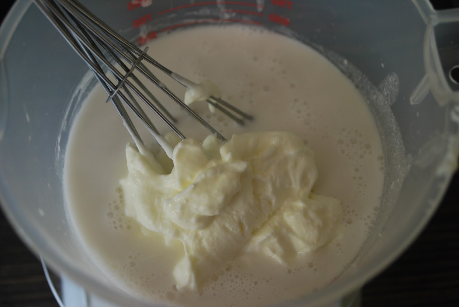 While the gelatine is absorbing, take a mug-type mixing bowl (I actually used a measuring cup). Why a mug-type cup? It makes it easier to later pour the mixture into molds you’ll be serving the panna cottas from. Now add your coconut milk and yogurt and mix very well.