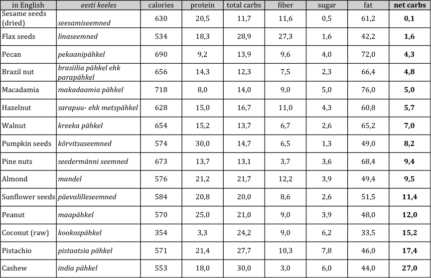 So here it is: a table where all nuts and seeds are sorted out starting with the item with the lowest net carbs (information per 100 grams).