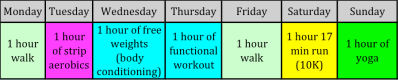 A good week for me. I’m happier, my muscles feel better, my mind is calmer and more focused, I had a good run after so many bad ones. The only thing I really don’t have a clue about is my weight. At home I weighed myself Saturday mornings before breakfast. Here I weigh myself in the evenings before working out. So you can’t really compare those numbers. The moment of truth comes next Saturday.