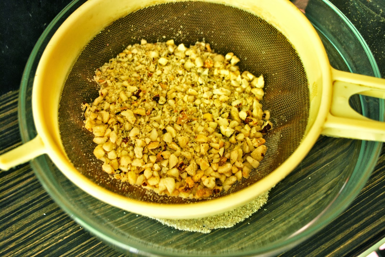 After some time you should have a little nut flour in your bowl. The rest of the grinded nuts in your sieve pour back into the food processor and grind again, sieve again etc. After doing this a couple of times, you should have something like this left: