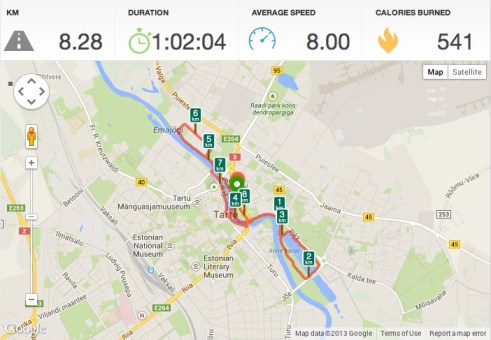 Thursday was such a nice day in Tartu. In the afternoon right after school I went running. I had a target pace of 7:30 per kilometre and that’s exactly what I got! Time: 1 hour 2 minutes, distance: 8,28 km. The weather was nice, the sun even peeked through clouds at times, a nice slight wind, some drops of rain… I just wondered the surroundings of River Emajõgi. Loved it!