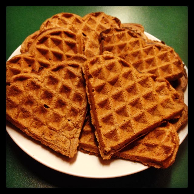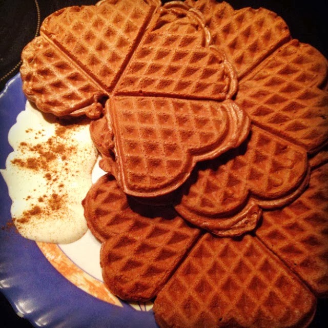 Pour some bater (about) into your waffle maker and cook until crispy and cooked, it really depends on what kind of waffle maker you are using. You can get 2 thicker waffles or 2,5 thinner waffles from this recipe.