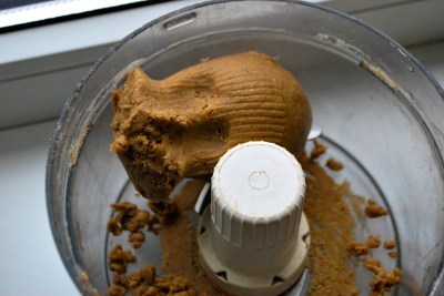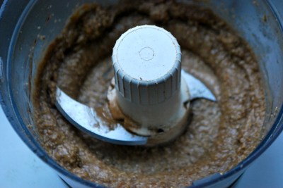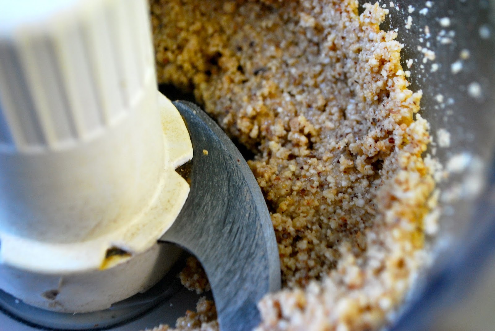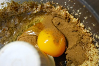 Now let the nuts cool a little and them blitz them up in a blender or food processor until nice and fine. Then add the egg, cinnamon and sweetener. Then you have a batter that looks like this: