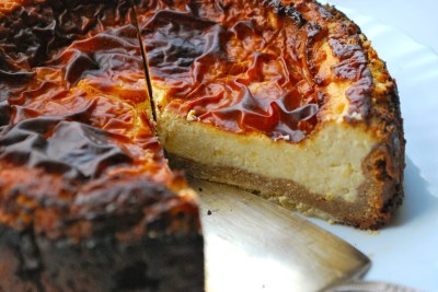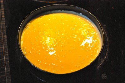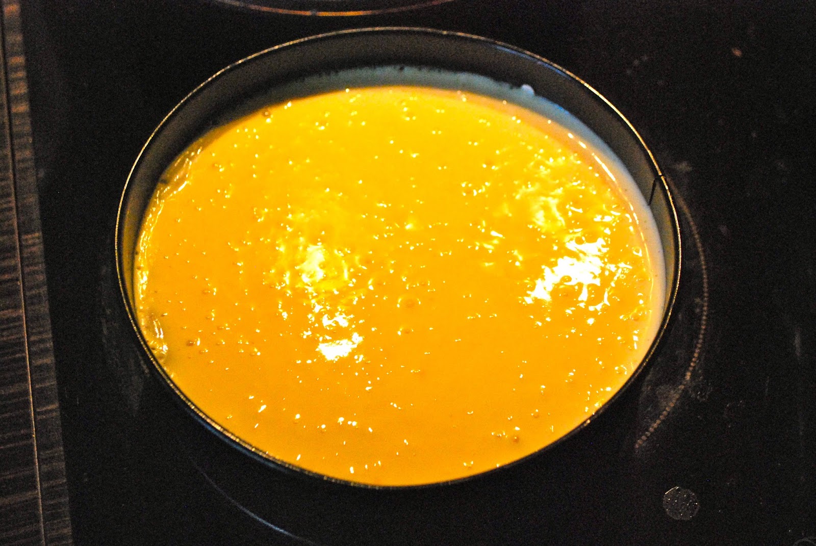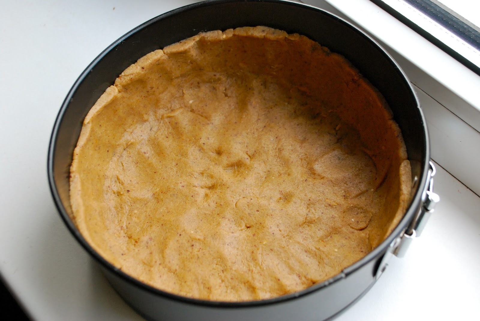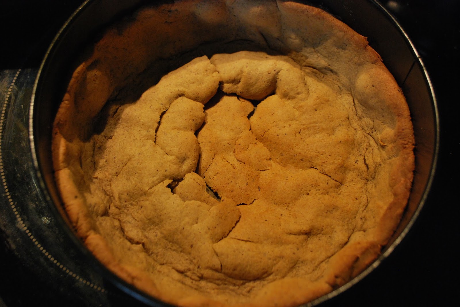 Now push the batter into your cakepan. Don’t forget to punch little holes in he base with a fork. I forgot and the base puffed up a bit too much.