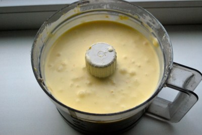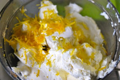 Now it’s time to make the filling. Take your cream cheese, eggs, sweetener, lemon juice and zest and mix well with a whisk or handheld mixer or food processor.