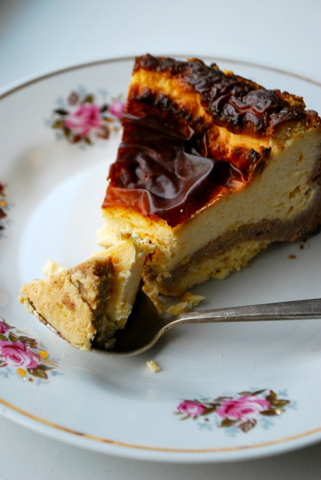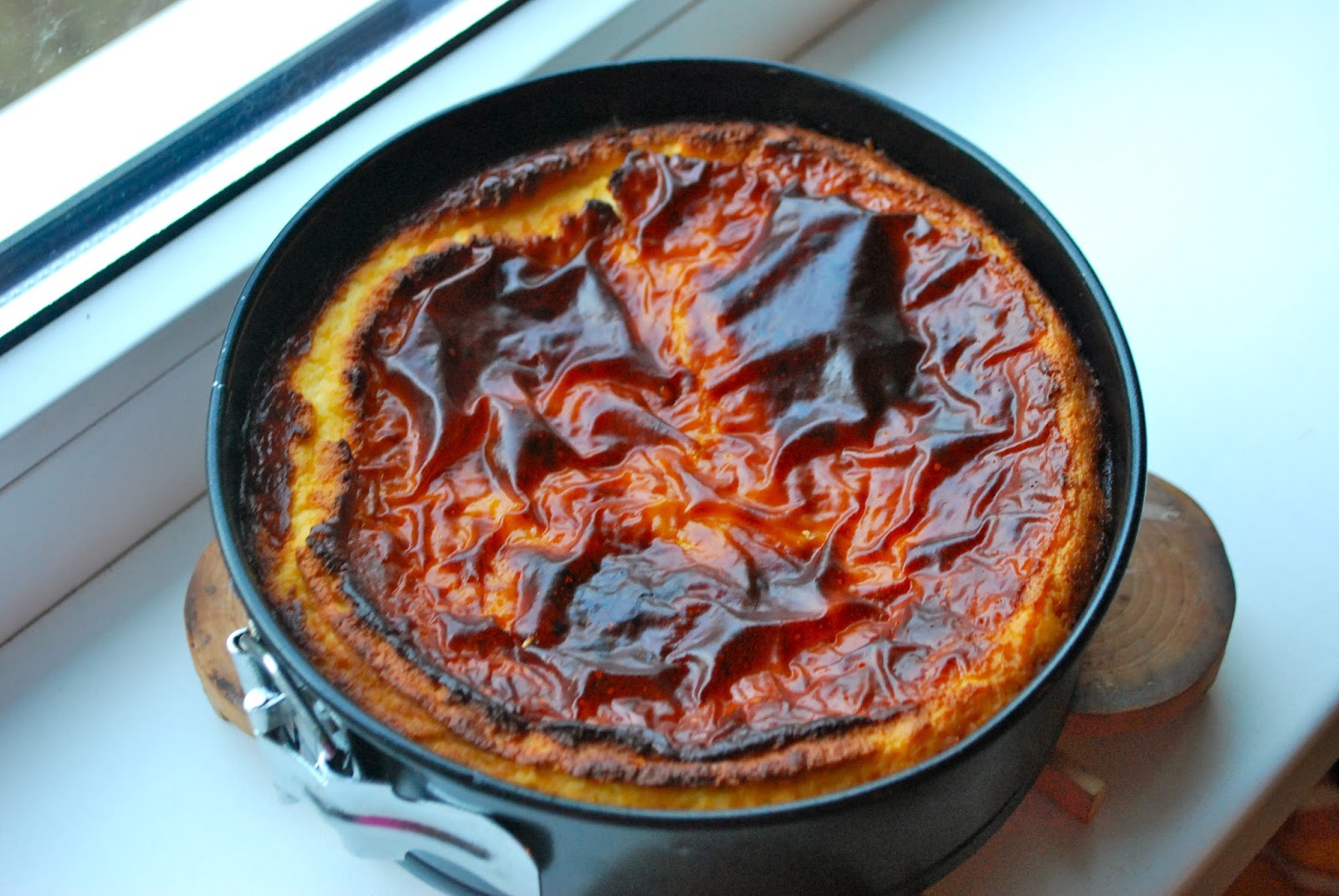 Taste the filling and add some more sweetener if needed. Next pour the filling on top of the prebaked base and put your cake in the 180 degree oven. It depends on the size of the pan. If you have a 26–28 cm pan, 45 minutes might be enough. 20–22 cm would require about an hour I assume. Since my pan was really little and the filling layer was really thick, I baked mine for an hour and 15 minutes. Bake it until the filling seems to be set.