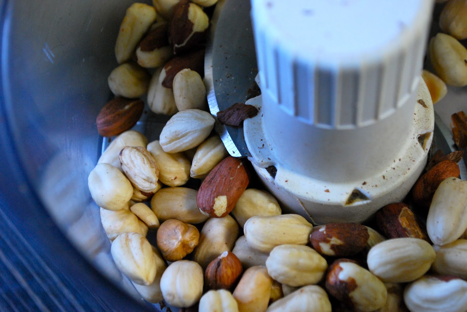First of all, roast the nuts. For that heat your oven to 200 degrees Celsius, pour nuts into a pan and dry roast them for about 10 minutes or until the little skins start to come off and nuts become fragrant. I bought my hazelnuts already roasted and skipped that step.
