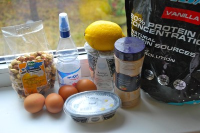 Add in protein powder. First try adding 25 grams, if the batter seems too wet, add more. I added in total 50 grams. If you add too much by accident, add a touch of water and it will be just fine. That’s what I did. My batter ended up looking like this: