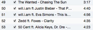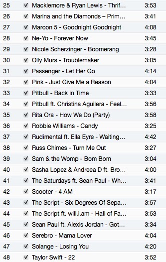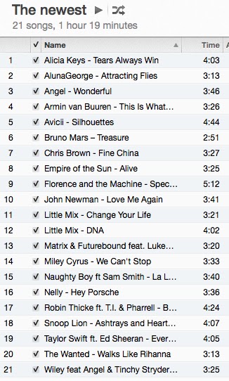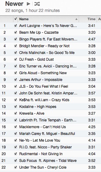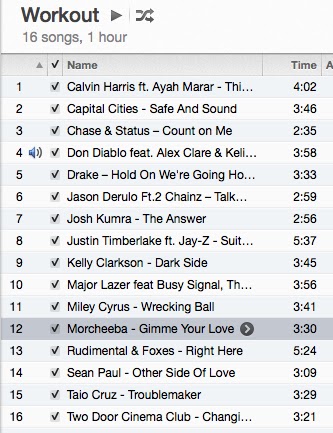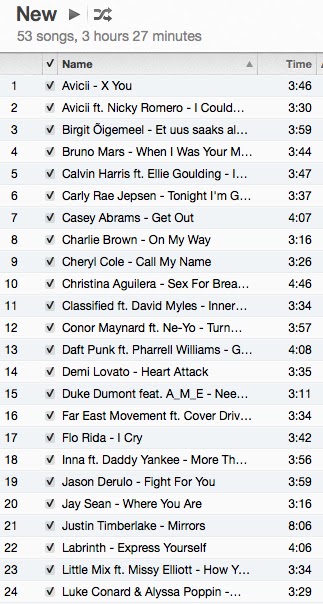 I thought some people might be interested in what music I like to listen to while working out, mostly while running. So here are some pictures from my playlists, called “New”, “Newer” and “The Newest” (yes, I’m THAT creative), “Trenn” (in Estonian that means workout), “Workout” and my latest playlist “1”.  I switch between these playlists but right now mostly listen to Workout and 1.