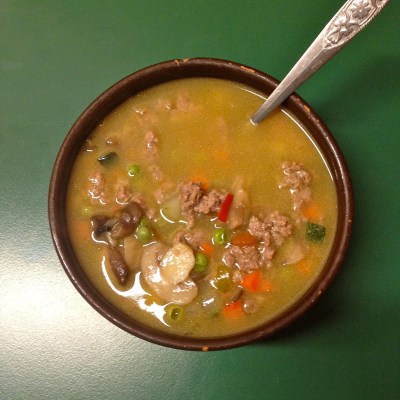 When the veggies are done, add in the meat. Let everything boil for another 2–3 minutes and serve.