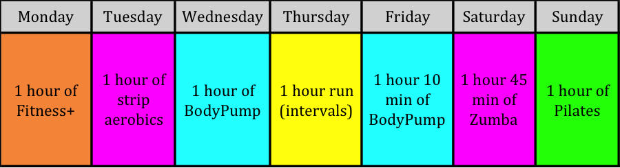 On Tuesday I felt a tiny bit sore from Monday. In strip aerobics we had a nice choreography and also mixed in some ab exercises. A good workout in general. Skipping strip aerobics for some weeks really made me enjoy it more again.