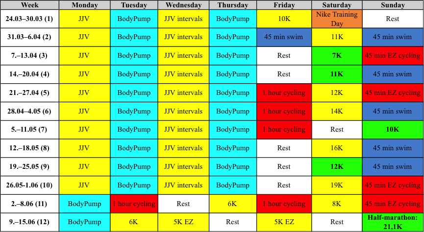 I registered in December 2013 and actually had a training plan ready even before that. I’m the master planner obviously 😀 I found the original 12-week training plan somewhere online, I think it was that one. I modified it to my personal preference and needs.