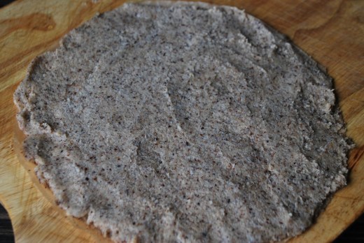 Now push the batter into your cake pan. You might need to wet your hands or use a small rolling-pin with water and then push it in, since the batter is a little bit sticky.