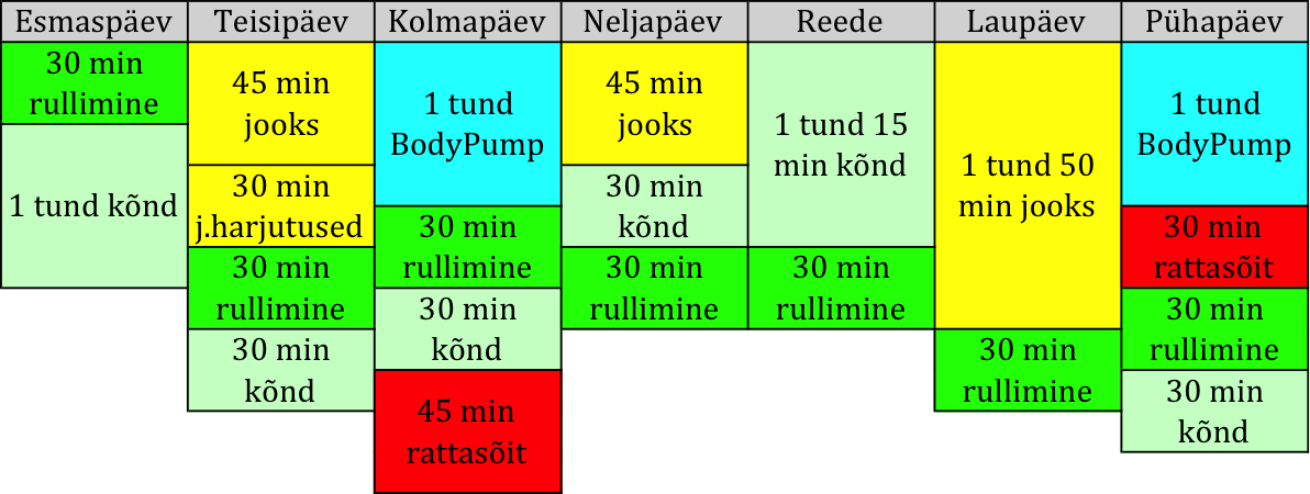 15 tundi kõlab küll jube suure numbrina, aga “nipp” seisneb selles, et veidi üle poole sellest ajast oli kõndimine või rullimine. Kokku tuli 2 puhkepäeva, aga tegelikult oleks pidanud tegema neid isegi 3 või rohkem. Igapäevaelus ei tunne, et keha oleks poolmaratonist väsinud, kuid trenni tehes annab see selgelt tunda. Sellel nädalal sai ikka korralikult valesid otsuseid tehtud: teisipäeval ei oleks tohtinud veel trenni teha, kolmapäeval veel raske Pump otsa (mõistus, uuuu, kus sa oled?) ning ka eilne pikk jooks oleks vist pidanud olemata olema. Pean asju rahulikult võtma ja mitte põdema. Korralikult taastumata trennis uuesti “lammutama” hakates ei tee ma lihastele mitte kasu, vaid hoopis kahju. Tuleb asju rahulikult tunde järgi võtta.