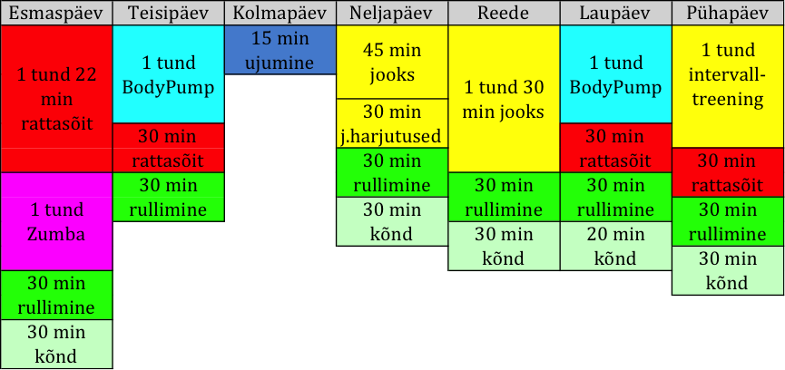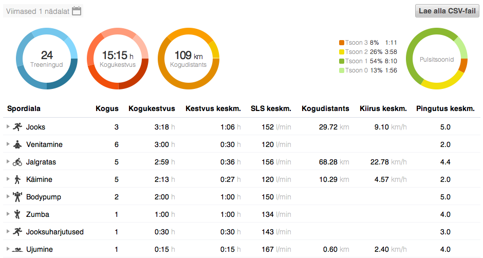 Kokkuvõttes tuli see nädal kuidagi uskumatult palju trenni, ilma kõnni ja rullimiseta tervelt 10 tundi! Minu kohta ikka päris palju. Ajaliselt kõige rohkem sain joosta, distantsilt ligikaudu 30 km. Kõik trennid ei olnud küll ülisuperhead, tundsin end aeg-ajalt jõuetult, kuid siiski nädala lõpp oli juba parem.