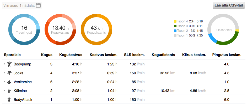 Pulsitsoonid näitavad, et rasket trenni tegelikult ma sellel nädalal ei teinud. OK, BodyAttackis ei pannud alguses kella käima ja tõenäoliselt käisin seal ka 5. tsoonis korraks ära, aga enamik “päris” trenne (ehk rullimine ja käimine välja arvatud) tegin ikkagi suhteliselt kerges 2. ja 3. tsoonis. Aga nii vist ongi õige? Pean end ikka tõsiselt selle pulsiteemaga rohkem kurssi viima. 😉