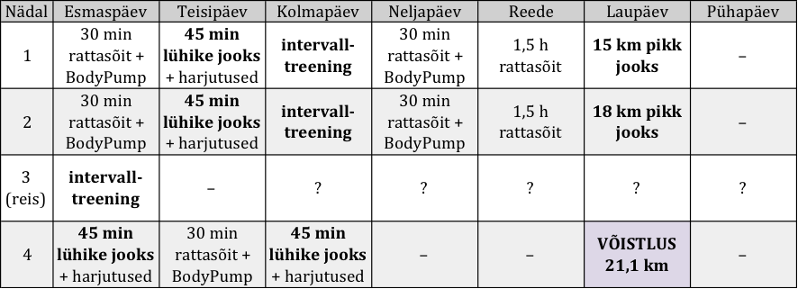 Aega on jäänud tegelikult ikkagi väga vähe. Viimane aeg leida üles kiirus (= kus on intervalltreeningud?), korralikud pikad jooksud (= 15+ km) ja samal ajal mitte endale liiga teha. Järgnevad nädalad peakski vist hakkama ainult jooksule rõhuma, BodyPump juurde lihastoonuse hoidmiseks ja vahele mõned otsad rattal. Siiani olen teinud 3 jooksutrenni nädalas, 2 Pumpi ja muud niipalju juurde, kui tahtmist ja tuju on. Ei teagi, kas muuta midagi või jääda sarnase plaani juurde… Asjale lisab “traagikat” veel asjaolu, et 4.–11. augustini olen Saksamaal, kus kindlasti saab olla aktiivne ja ka mitmeid kordi koos Heidi ja Elariga jooksurajale, aga päris kindel pole, kui pikad otsad, mis kiirusega jne tulevad.