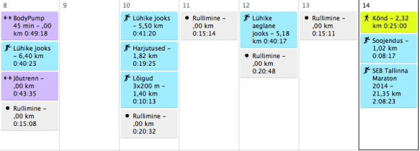 Jään nädalaga väga rahule. Kimbutas mind küll halb jalavalu, aga see ei taksitanud mul rekordeid joosta. Hea nädal oli. Järgmisel nädalal suuri plaane pole, kõik rahulikumad trennid, ei mingit BodyPumpi ja taastumine, sest järgmine poolmaraton toimub juba vähem kui 3 nädala pärast! 🙂