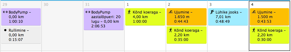 Sai tehtud rahulikum nädal ja vähem treeningtunde. Ma kipun kogu aeg ära unustama, et alles 9 päeva tagasi andsin oma kehale Pekist Priiks matkaga väga korraliku laksu ja tegelikult on see rahulikult võtmine täiesti OK, pigem isegi vajalik. Narr on aastat nii loiult alustada, aga mis siis ikka. Järgmisel nädalal lähen juba kohaliku treeneri BodyPumpi, külastan rohkem ujulat ja loodetavasti püsib ilm enam-vähem normaalne ning saan ikka õue jooksma ka. Pean mõned korralikumad venitamised ka nädalasse mahutama, sest rulli mul siin ju kaasas ei ole.
