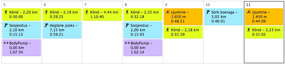 Ausalt öeldes ei jäänud ma nädalaga üldse rahule. Miks? Vastus peitub pulsinumbrites ja minu enesetundes, mis on kergelt kahtlane. Jooksu ajal tahab pulss lakke ronida isegi ülipisikese kiiruse juures. BodyPumpis on keskmine pulss ligi 10 lööki kõrgem kui tavaliselt. Unekvaliteet pole kiita. Ise olen hetkel selle teooria juures, et taastumist jäi pärast Pekist Priiks matka liiga väheks. Esimesel nädalal pärast üritust tundsin end liigagi hästi ja vist pingutasin natuke üle. Nüüd lööb see siis lõpuks välja. Nojah, ma ei teagi enam. Äkki olen hoopis haigeks jäämas? Üks pereliikmetest võitleb siin palaviku, nohu ja külmetusega. Eks ma siis jälgin asjade käiku ja teen omad järeldused.