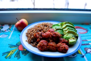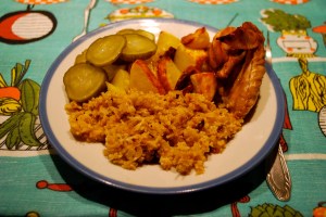 Õhtuks praetud veisehakkliha, veidi kodujuustu, salatilehed.