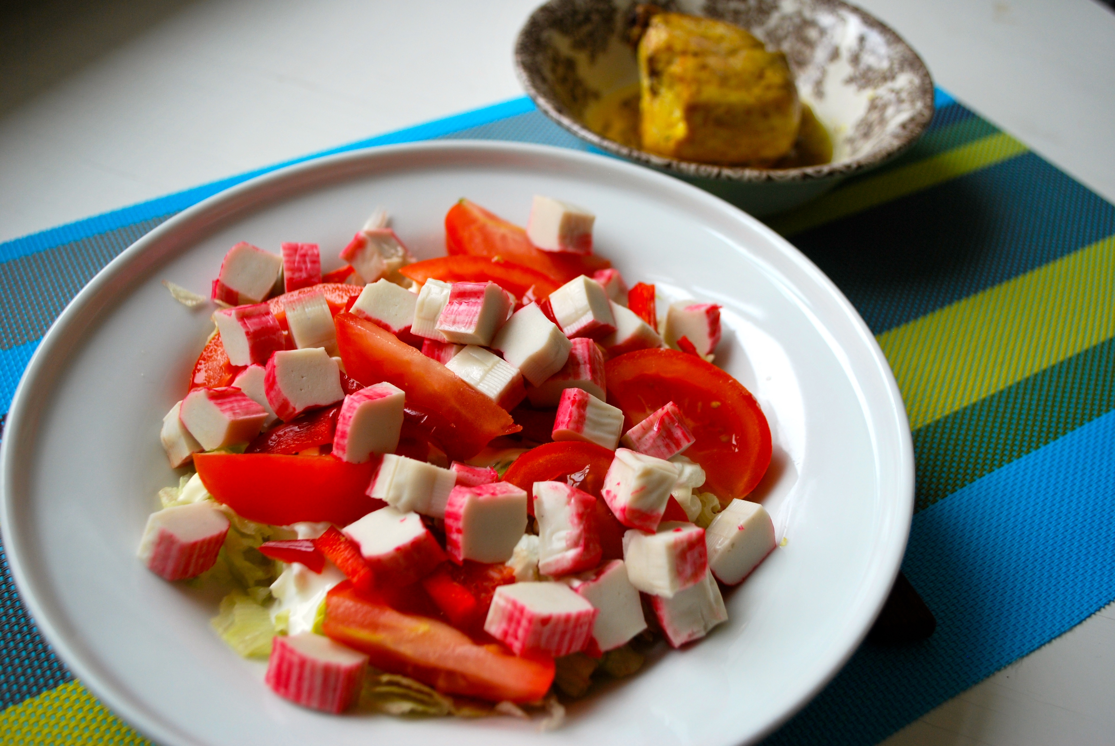 - jääsalat, tomat, paprika, 10% hapukoor, krabipulgad