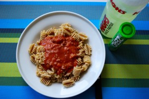 Traditsiooniline laadimise söök: pasta. Seekord täisterapasta, peal veiselihast, sibulast, natukesest oliiviõlist ja purustatud tomatitest kaste. Juurde jõin magneesiumi ja elektrolüütidega tsitrusemaitselist spordijooki.