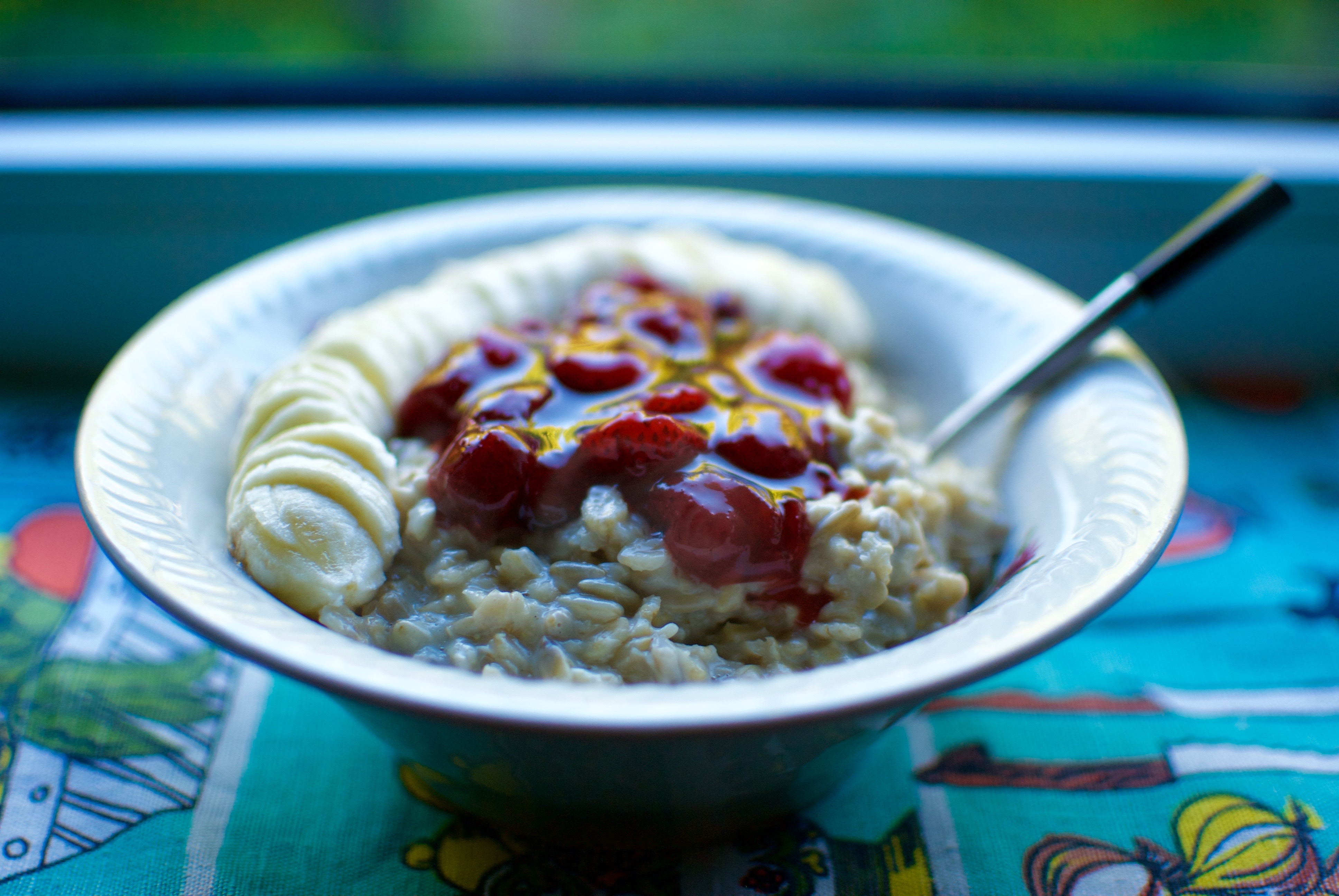 Tõeline mägi piima ja veega keedetud kaerahelbeputru, sees rohkelt päevalilleseemneid. Peale lisasin maasikamoosi ja banaani.