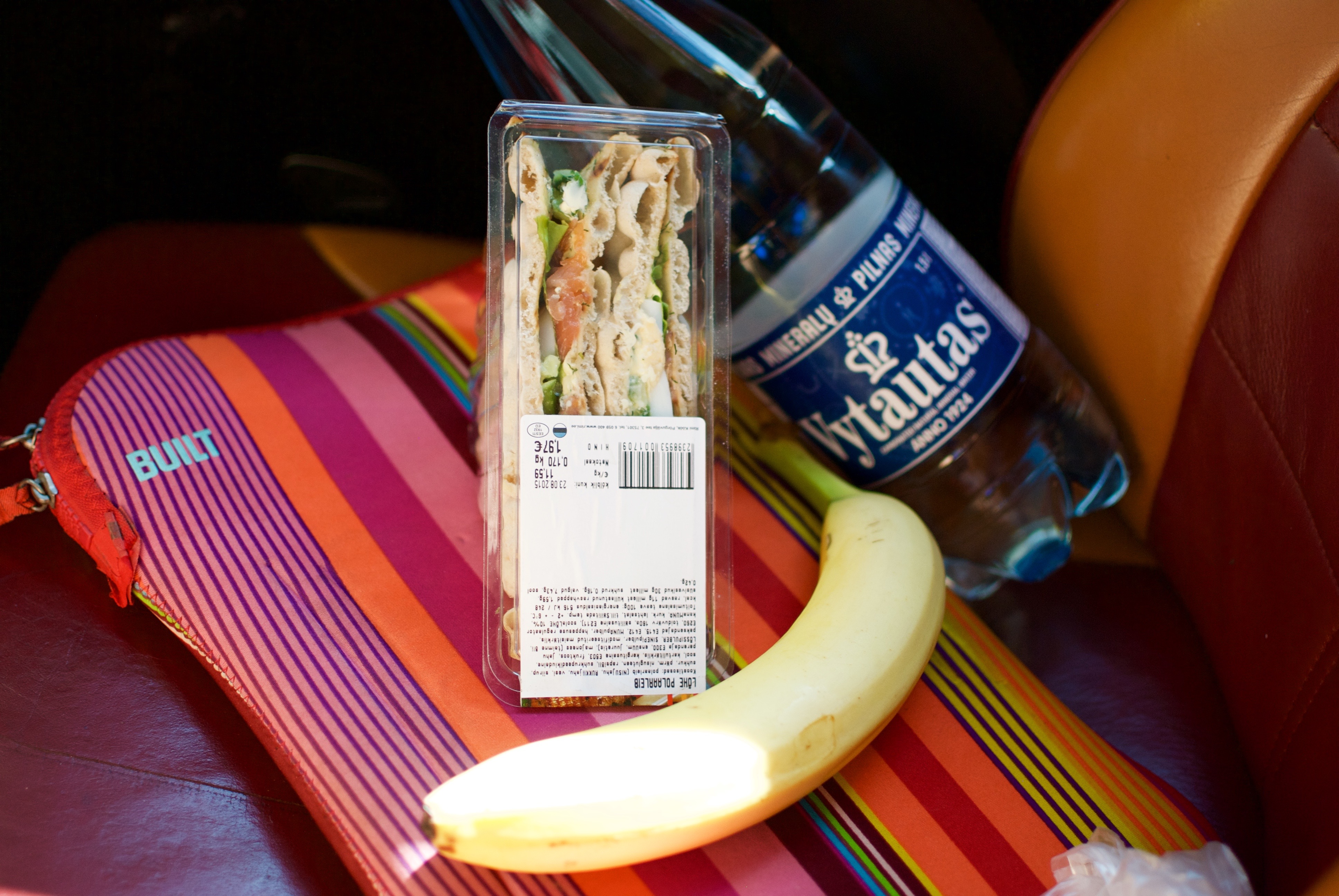 Kiirelt enne bussile suundumist hüppasin Rimist läbi ja proovisin kiirelt midagi hamba alla leida. Korvi maandus veel üks banaan, lõhe ja munaga võileib ning suur mineraalvesi.