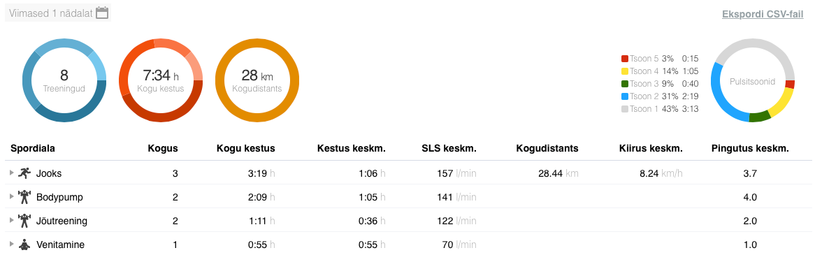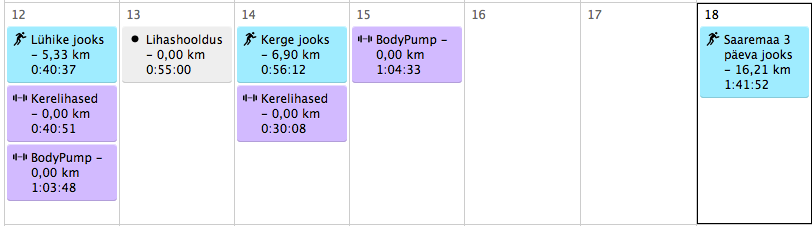 Kokkuvõttes suutsin jälle uskumatult normaalse koguse trenni oma tihedasse nädalakavasse mahutada. Nädalaplaan sai täidetud ja puhkus Saaremaal oli niiiii mõnus. Eks näis, kui palju/vähe trenni järgmisesse hullumeelsesse nädalasse mahub. Midagi ikka. 🙂 Järgmisel nädalal kirjutan äkki 3 Päeva Jooksust ka.