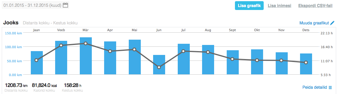 Kõige aktiivsem märtsis, kui tegin 38 (neto)tundi trenni. Juunikuine ‘auk’ oli põhjustatud Narva poolmaratonil ära lõhutud põlvest, augusti oma on seletatav sellega, et võitlesin siis ülekoormusega. Septembris võtsin pärast maratoni paariks nädalaks aja maha.