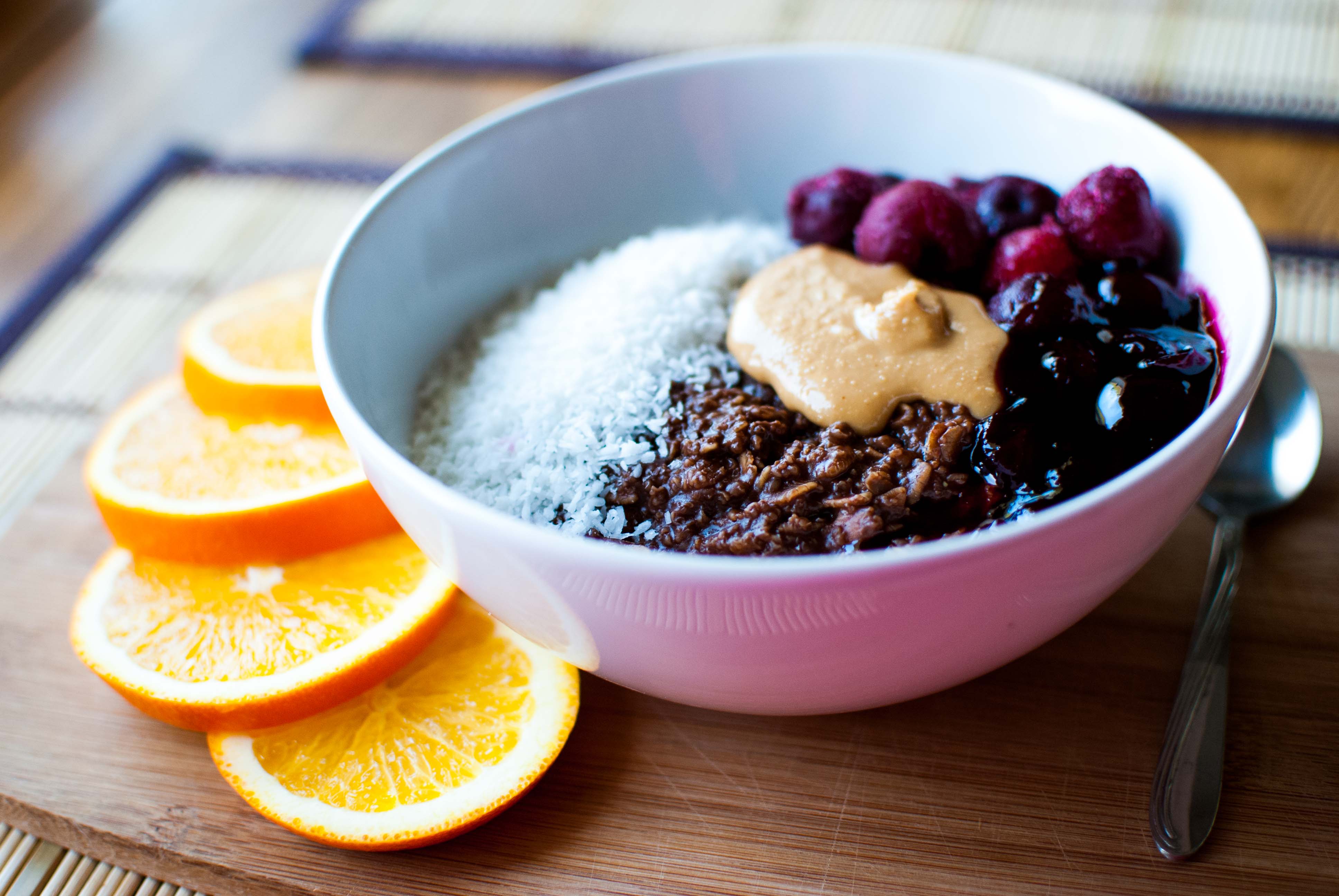 Juba selle pildi vaatamisest hakkavad süljenäärmed tööle. 🙂 Teil ka? Mmm, kui hea! Kakaoga kaerahelbe ja -klii puder (vesi, piim, 1 tl suhkrut, sool, kaerahelbed, kaerakliid, tume kakaopulber), serveeritud kookoshelveste, külmutatud kirsside, kirsimoosi ja maapähklivõiga. Mõnusaks mahlaseks ampsuks üks apelsin.