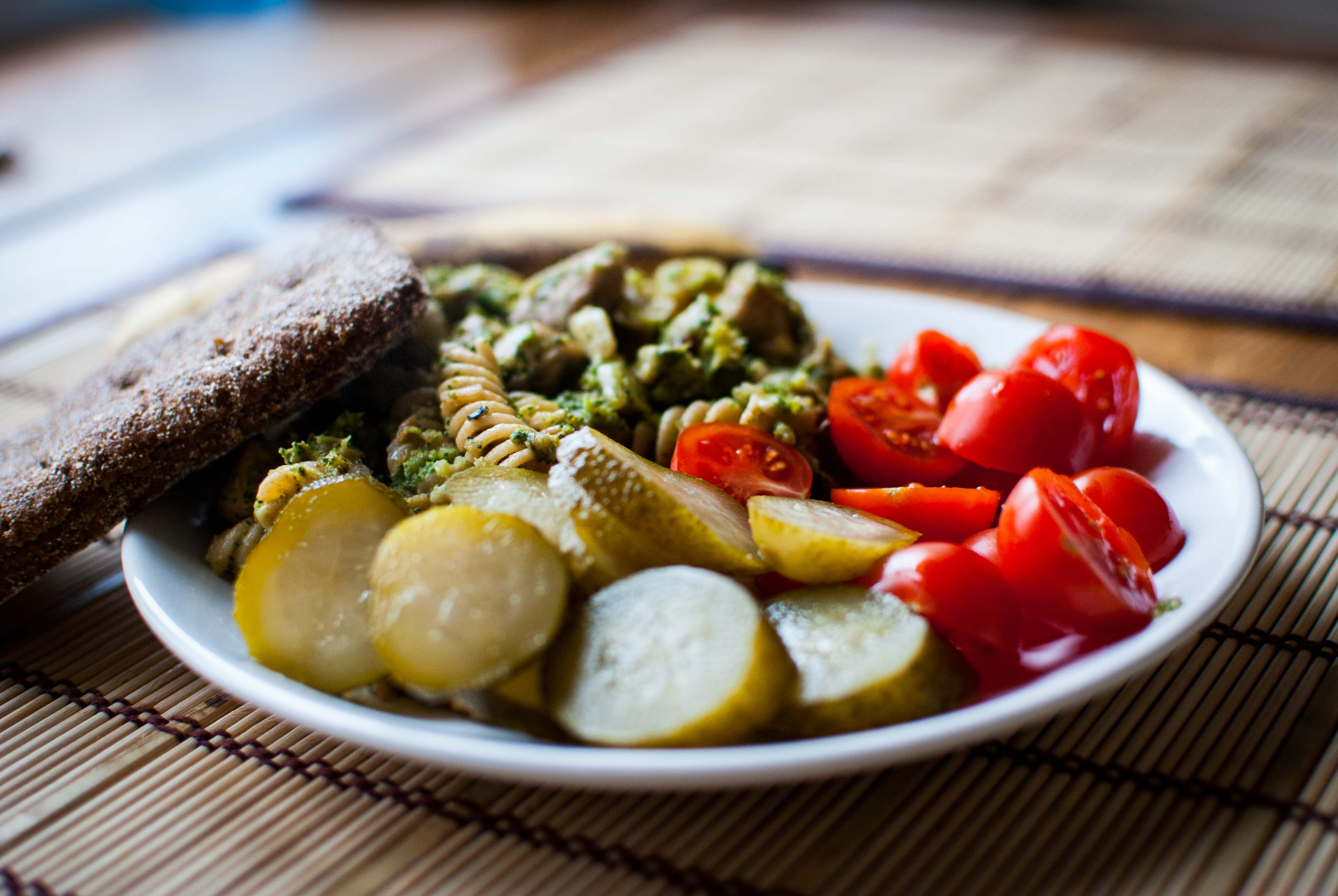 Lõunaks sõin kana-brokkoli pastat (täistera fusilli, keedetud brokkoli, sibulaga praetud kanafilee, küüslauk), kõrval peotäis kirsstomateid ja 1 marineeritud kurk. Et kõht täis saaks, siis juurde üks Rukkipala tasku ka ja magustoiduks väike üleküpsenud banaan.