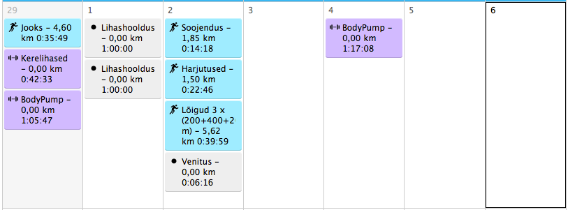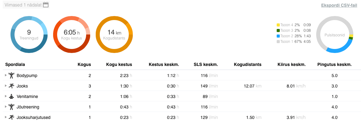 Esmaspäev: Jooks Jõud Venitus + BodyPump. JJV-s rekordilised 46 inimest. Väga väga kitsas oli ja päris rasked harjutused ka, õigemini väga lühikesed pausid harjutuste vahel. BodyPumpis tagasi 96. kava juurde. Raske surm. 😀 Jalad olid pikast jooksust tühjad ja kükid ning väljaasted võtsid viimase välja.