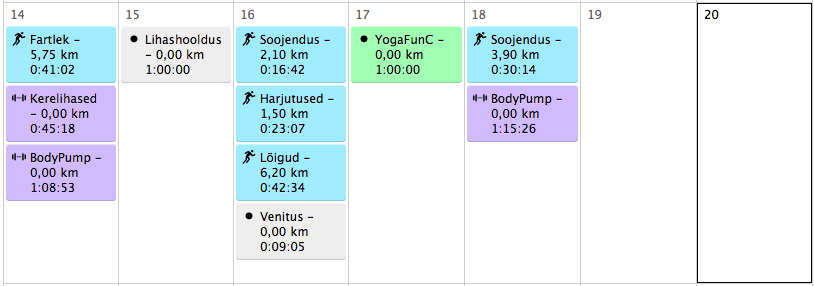 Kolmapäev: Jooks Jõud Venitus. Lõigupäev. Soojendus, jooksuharjutused ja lõigud: 400+400+400, 400+200+400, 400+400+400. Väljakutsuv oli, kindlasti. Suhteliselt aeglane olin ka. Natuke kurb oli, et kõik need inimesed, kellega kunagi koos lõike jooksin, on nüüd minust nii palju kiiremad. Aga mis seal ikka. Andsin endast parima.