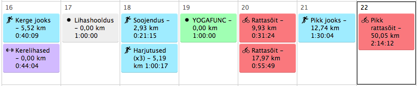 Esmaspäev: Jooks Jõud Venitus. Kuna võistlus oli üsna värskelt seljataga, siis oli taaskord aeg end tagasi hoida. Kerge 40 min jooks (7:16 min/km, 147 bpm), selle peale 40 min harjutusi topispalli ja keharaskusega kerelihastele. Ei olnud ei kerge jooks ega jõuosa.