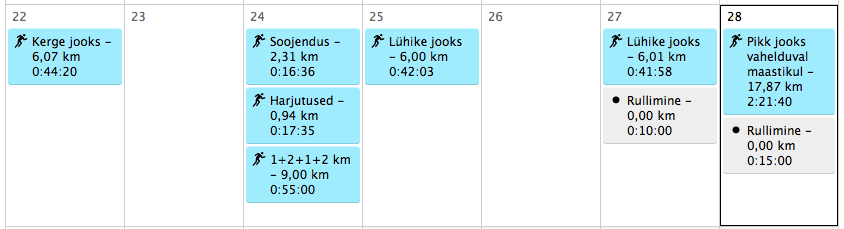 Pühapäev: pikk jooks vahelduval maastikul. Esialgu oli mul plaanis 2 tundi rahulikku jooksu Tartus sileda maa peal. Aga kui treener ütleb teisiti, siis nii teeme.