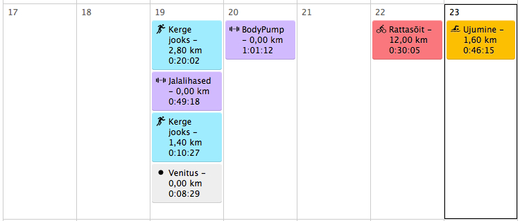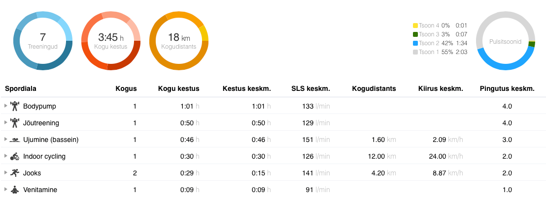 Neljapäev: BodyPump. Kuna reedel sõitsin vanemate juurde, siis tuli Pump neljapäeval ära teha. Võõra treeneri trenni väga minema ei kiskunud, aga läksin ja täiesti tore oli. 🙂 Isegi lisasin natuke raskusi ja kõik sujus hästi. Avastasin, et 99. programmi muusika on minu jaoks täitsa meeldiv.