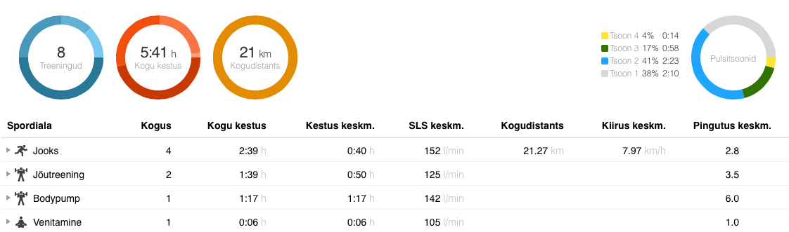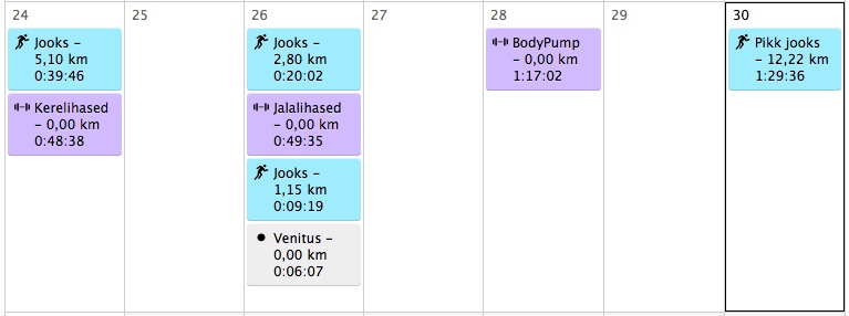 Esmaspäev: Jooks Jõud Venitus. Esmalt jooksime 40 minutit koos Tauri ja Marisega. Jutustades läks aeg väga ruttu ning üldiselt oli mõnus kerge jooks. Edasi jätkasime jõuosaga kerelihastele. Erinevad keretõsted, puusa rullimised, plangud (surumisega ja ilma), puusatõsted, harjutused seljale, topispallide visked. Ausalt öeldes oli mul järgmisel päeval läbi nii kõht, küljed kui ka selg. Järelikult: toimis! 🙂