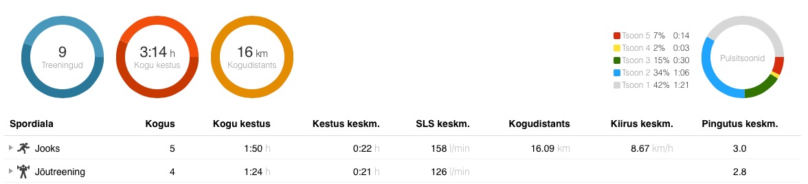 Esmaspäev: Jooks Jõud Venitus. Tavapärane kerelihaste päev igasuguste tõstete, pöörete ja plankudega. Korralikult võttis läbi.