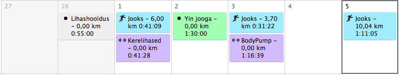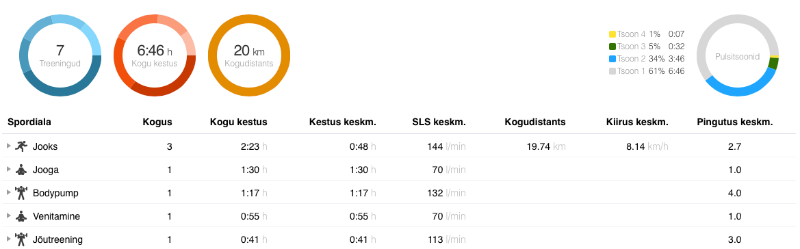 Kolmapäev: Jooks Jõud Venitus. Lõike jällegi joosta ei lubatud, et kindlasti pikast jooksust taastuda. Hea, kui treener ikka silma peal hoiab. 🙂 Minu pikka nägu nähes lubati tavalisse 40 min jooksu kiiremad sutsakad sisse panna, seega 4 blokki, üks blokk koosnes 7 min sörgist ja 3 min kiiremast jooksust. Edasi tegime kerelihastele harjutusi ja ajasime juttu ja üldse oli tore.