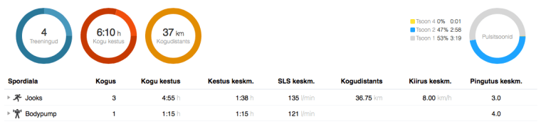 Reede: kerge jooks + BodyPump. Mõtlesin, et proovin siiski trenni minna, kuigi hommikul oli kurk jälle valus. Joostes olid jalad ikka totaalselt väsinud ja säärtes oli isegi veidike lihasvalu. Tegime koos Kairega 3 km ja ronisime BodyPumpi. Hoidsin veidi raskustega tagasi ja kükkides panin poole loo pealt üldse kangi seljast maha. Üldiselt oli minu natuke haigel kehal isegi lihtsam kui eelmisel nädalal, kui ma totaalselt surin Pumpis.