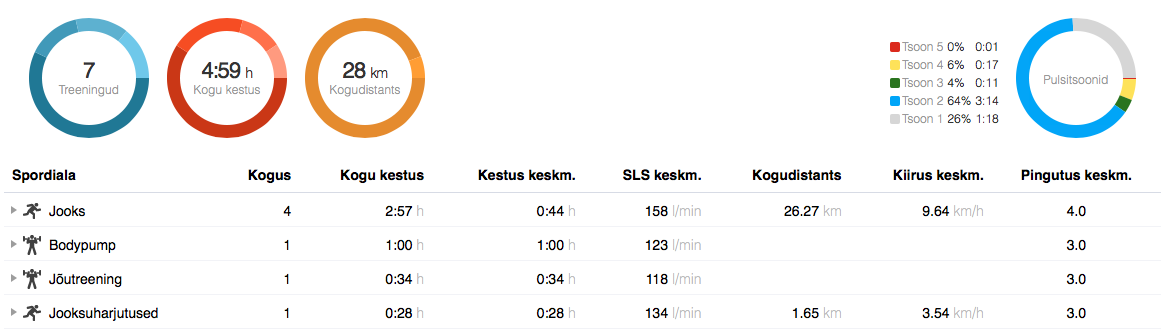 Seekordne fartlek: 7 minutit kerget jooksu, 3 minutit tempokat jooksu, seda 10-minutilist blokki korrata 5 korda. Kõhus kippus pistma hakkama ja jooks oli seega üpris ebamugav, kuid lõpp läks juba paremaks. 6:36 min/km, 155 bpm. ÜKE osas keskendusime kõhule ja seljale: topispallidega visked, plangud, puusatõsted.