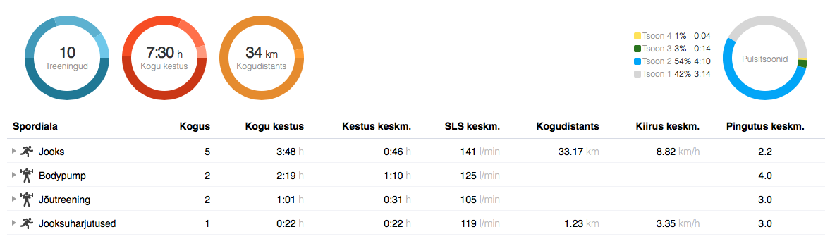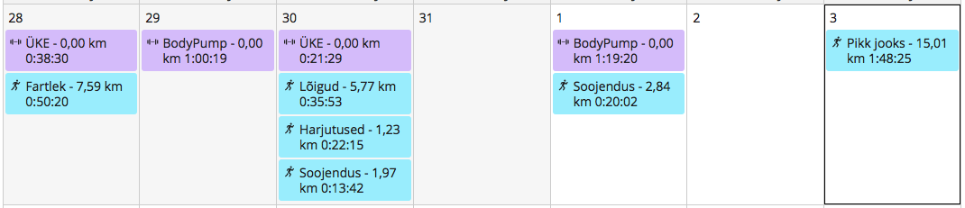 Järgmisel nädalal saab kolmapäevane trenn ilmselt raske olema, sest koos tänasega tuleb mul neli trennipäeva jutti. Hea meelega jätaks teisipäevase Pumpi vahele ja teeks ainult reedese, aga reedel ma töö tõttu kahjuks Pumpi ei jõua ning asendan selle ilmselt ühe õhtuse kerge jooksuga, pärast pikka istumisepäeva. Pikk jooks läheb ikka pikemaks ja muu annab Treener ette, seega ise midagi palju mõtlema ei pea, see on alati suurepärane. 😅