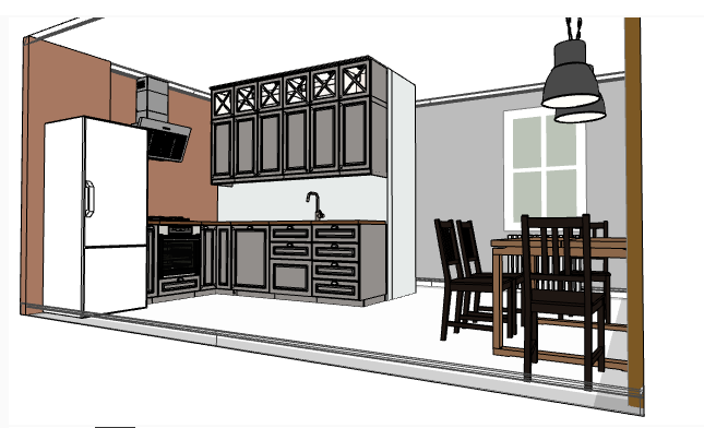 - külmik: ideaalis võiks see olla 70 cm laiune, kuna korstnajala laius on ca 80 cm (joonisel on külmik valge, tegelikkuses tuleks roostevabast terasest),